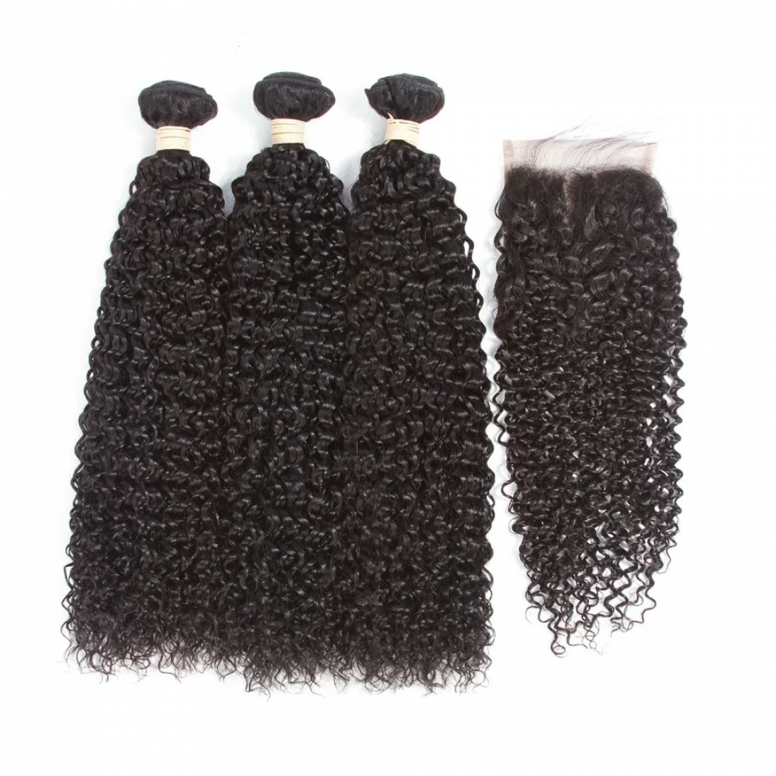 100% Remy Human Hair 3 Bundles with 4x4 Lace Closure – Kinky Curly, Natural Color